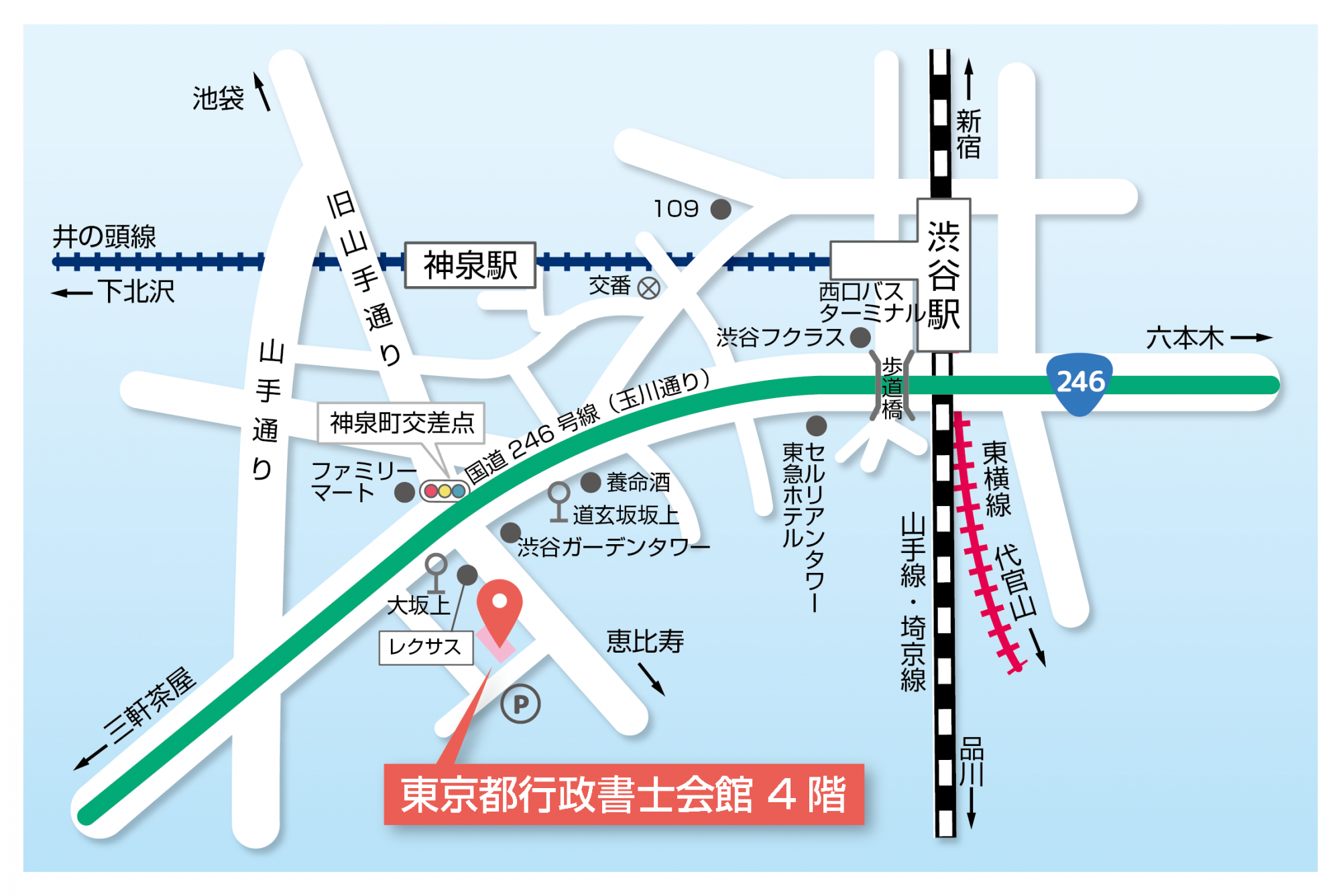 歩道橋を渡り、国道246号線(玉川通)を三軒茶屋方面に歩き、セルリアンタワーを通過し、神泉町交差点を渡り、左折します。